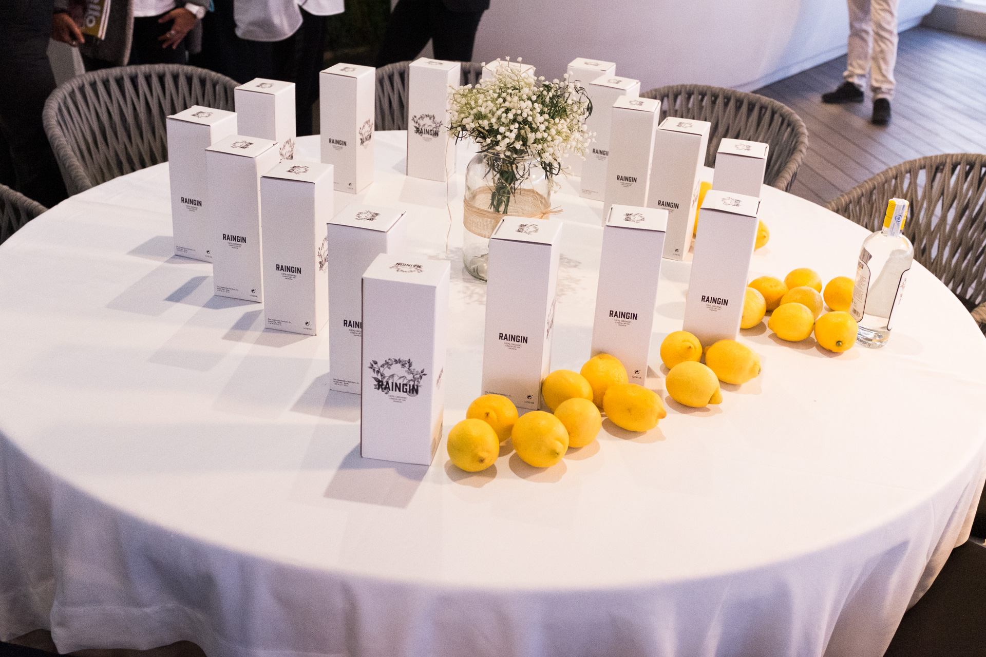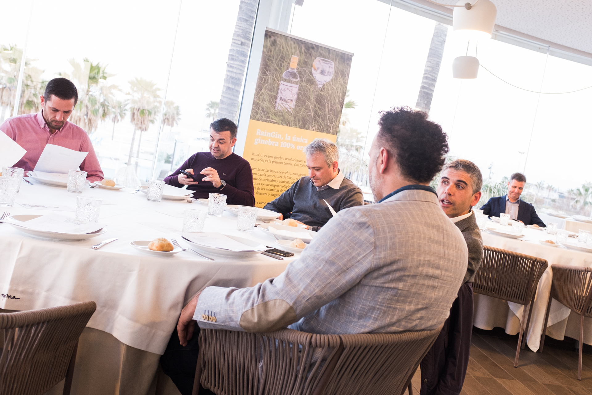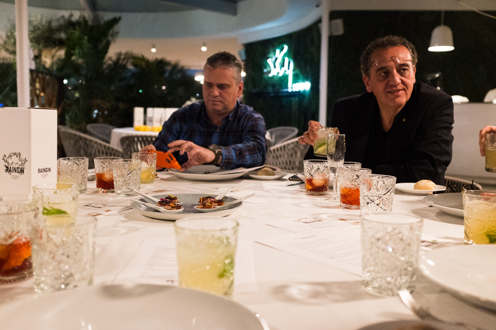 El menú comenzó con un Rain Negroni acompañado de un aperitivo de ceviche de gambón; a continuación se sirvió un Rain Germain, que además de RainGin llevaba Sant Germain lima, clavo, canela y sweet and sour. El primer plato, una lubina a la brasa, se maridó con un Rain Collins, un clásico y refrescante Tom Collins con RainGin.